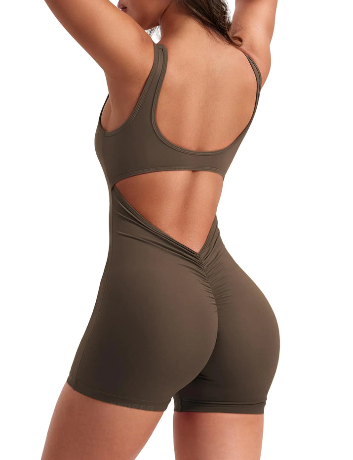 YEOREO One Piece Workout Jumpsuits for Women Backless Tummy Control Sleeveless Jumpsuits Lizvette V Back Scrunch Yoga Romper Coffee M